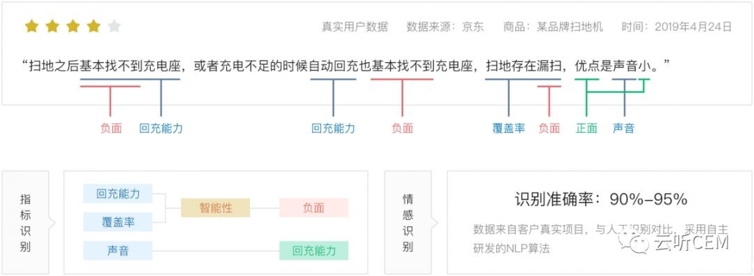 如图所示,betway必威西汉姆联官网的NLP技术能够对客户的一句评价文本,根据为科沃斯量身搭建的365°细粒度数据指标体系进行一一划分,提取典型意见,并且判断其情感正负面倾向。