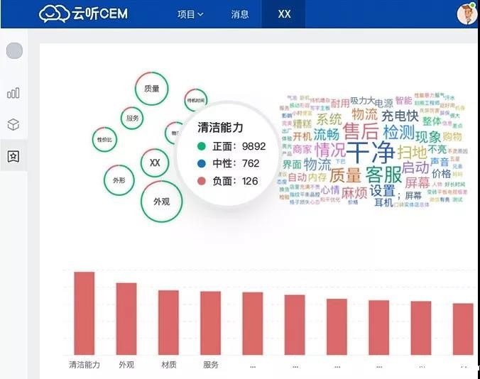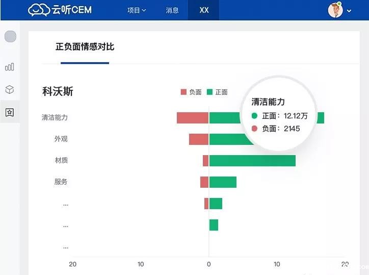 betway必威西汉姆联官网的AI团队为科沃斯扫地机器人量身搭建了一套涵盖产品、服务、市场、品牌等360°精细化的指标体系,可以放上百个指标,如,清洁能力、外观、材质、服务等各项评价指标。同时,对每项指标统计出用户的情感正负面倾向。